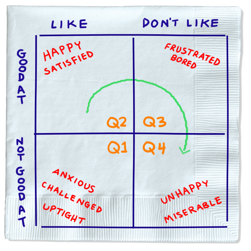 The Doom Loop provides some insight into this natural phenomenon and can serve as a simple and elegant little tool to help someone who might be bored/frustrated on the job to make good tactical career decisions as well as to anticipate various career crises.